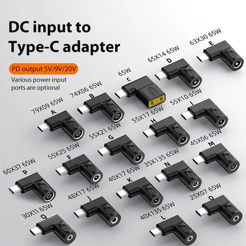- 1x Entrada de CC 5,5 x 2,5 mm 65 W a Adaptador de Corriente PD USB-C/Tipo-C