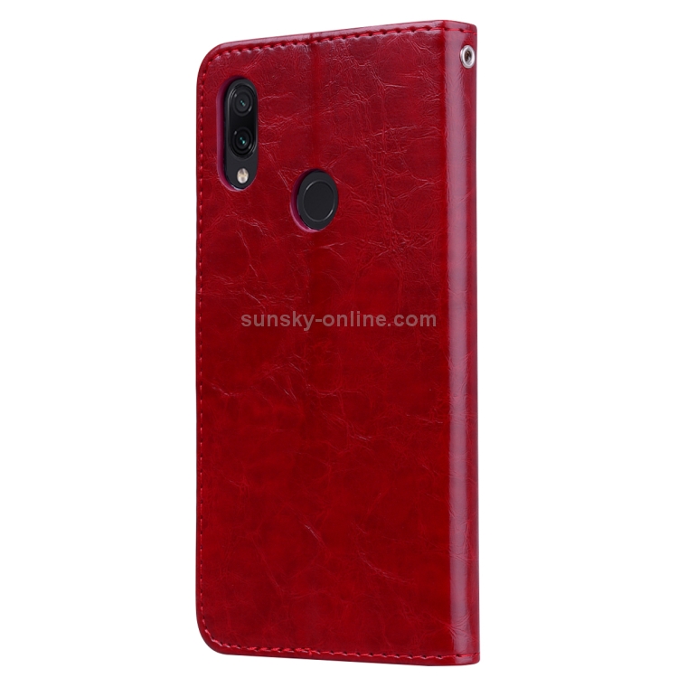 Estuche de Cuero con Tapa Horizontal con Textura de Cera de Aceite de Estilo Empresarial para Xiaomi Redmi Note7, con Soporte, Ranuras para Tarjetas y Billetera (Rojo)