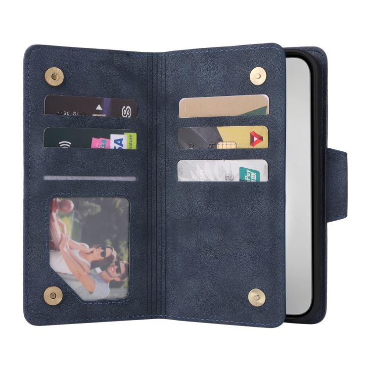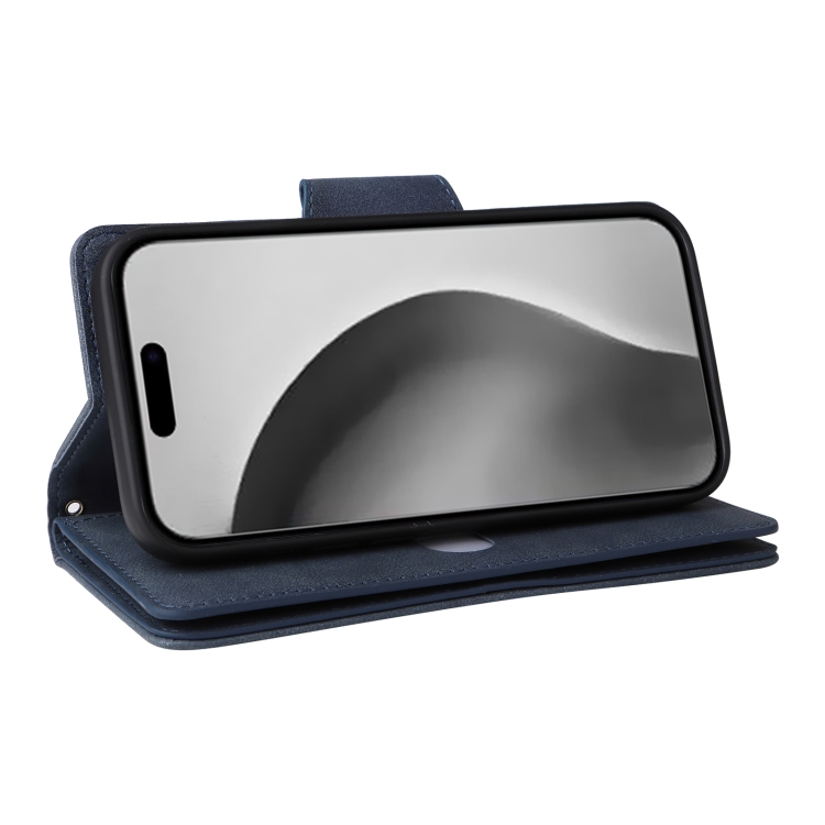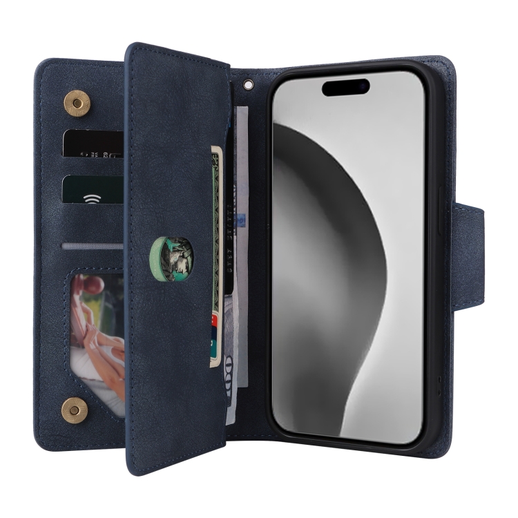 Funda de Cuero para iPhone 16 Pro con Tres Pliegues y Hebilla de Remache (Azul)