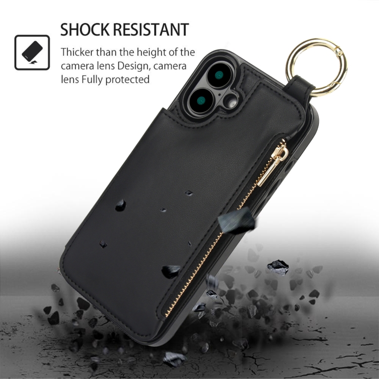 Estuche para Teléfono iPhone 16 Plus Cremallera Anillo Doble Hebilla Antirrobo (Negro)