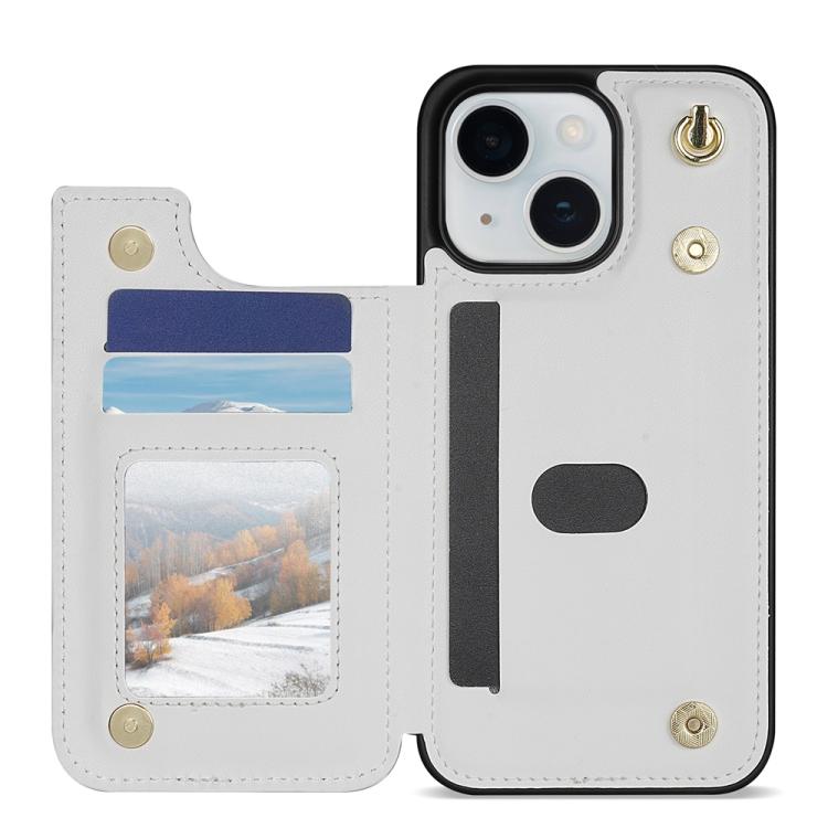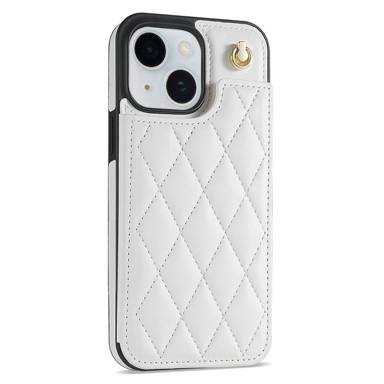 Estuche para Teléfono iPhone 13/14 Ranuras Tarjetas Hebilla Doble Rombal Cordón (Blanco)