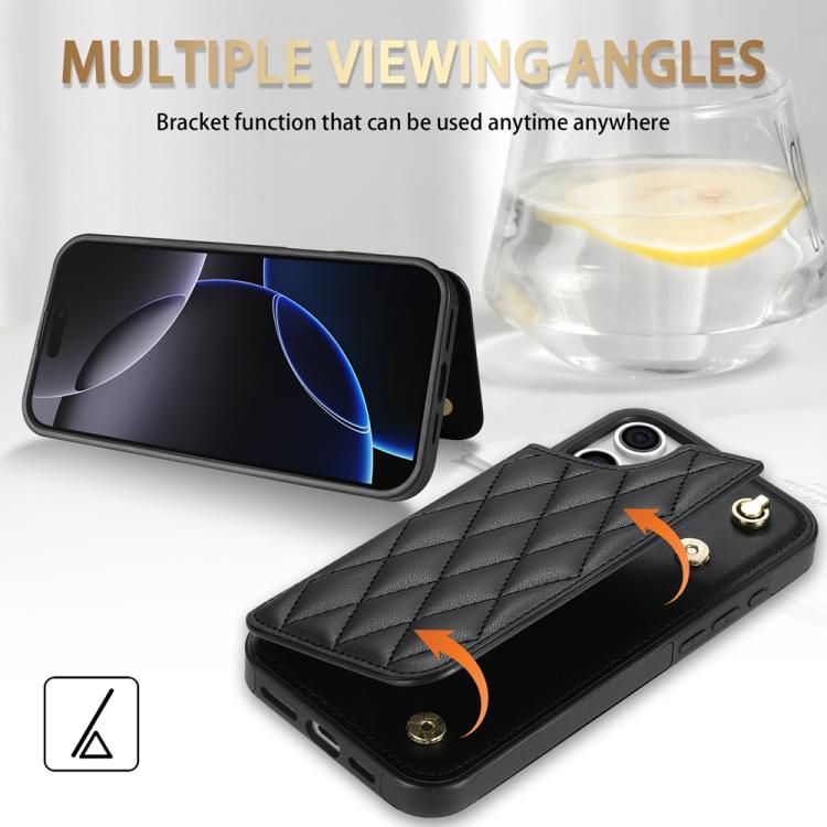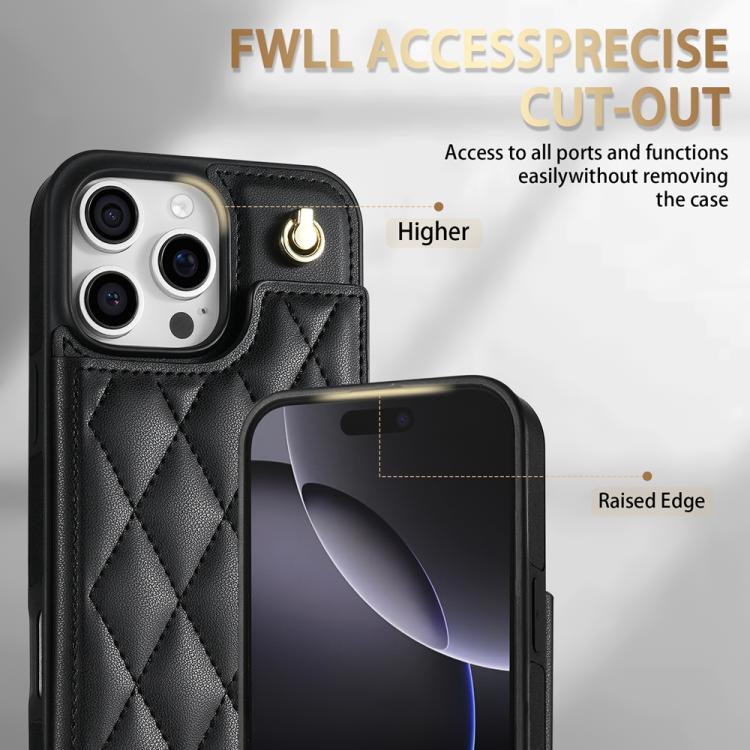 Estuche para Teléfono iPhone 14 Pro Max con Ranuras para Tarjetas y Hebilla Doble Rombal con Cordón (Negro)