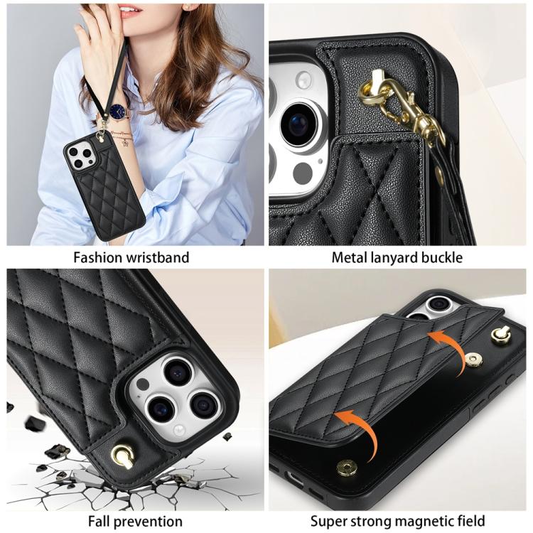 Estuche para Teléfono iPhone 16 Pro Max con Ranuras para Tarjetas y Hebilla Doble Rombal con Cordón (Negro)