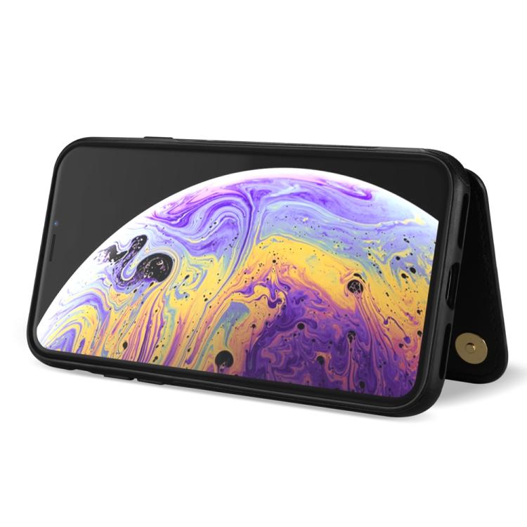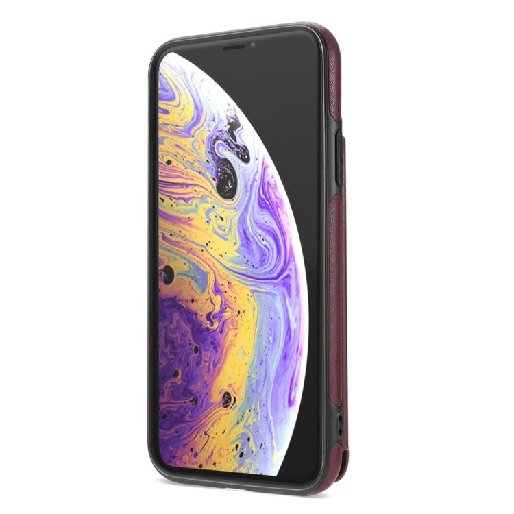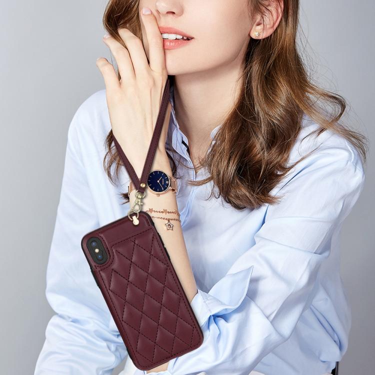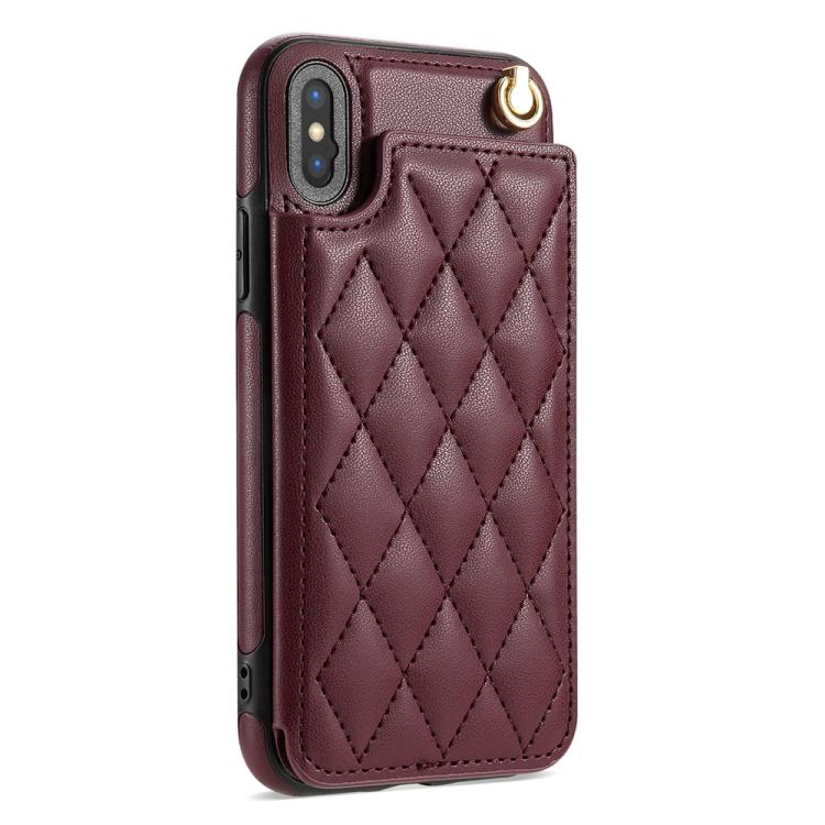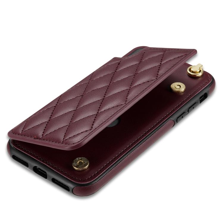 Estuche para Teléfono iPhone Xr Ranuras Tarjetas Hebilla Doble Rombal con Cordón (Rojo Vino)