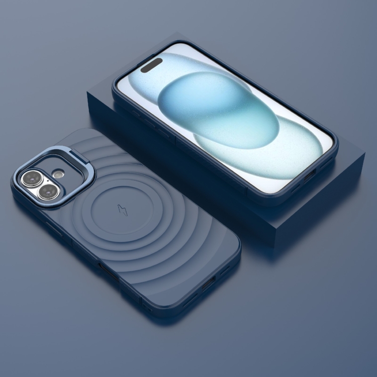 Estuche para Teléfono Magsafe iPhone 16 Plus Soporte Marco Lente Corrugado (Azul Oscuro)
