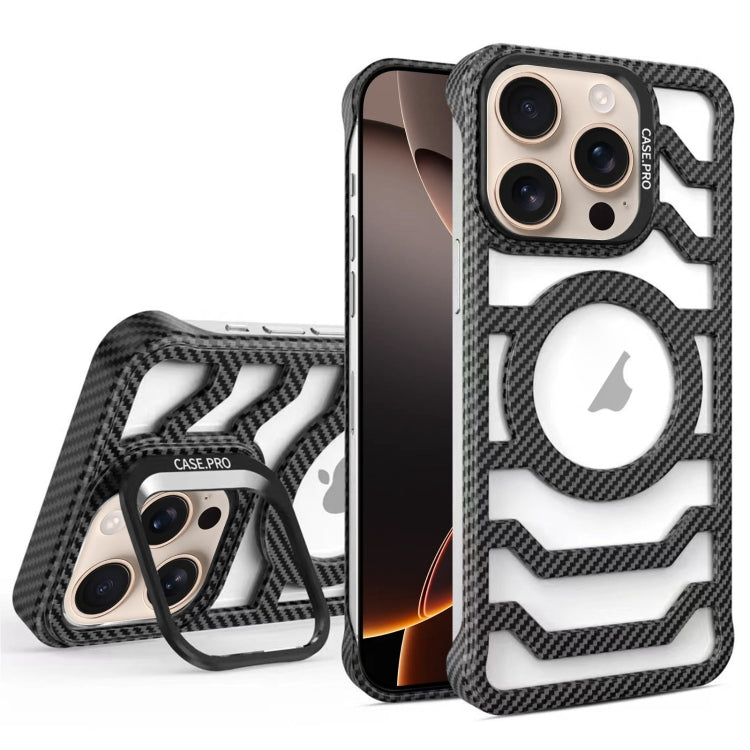 Estuche para Teléfono Magsafe con Soporte y Protección de Lente Fibra de Carbono para iPhone 16 Pro (Negro)