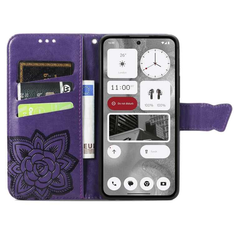 Estuche de Cuero para Nothing Phone 2 con Tapa Horizontal en Relieve Flor de Mariposa (Púrpura)