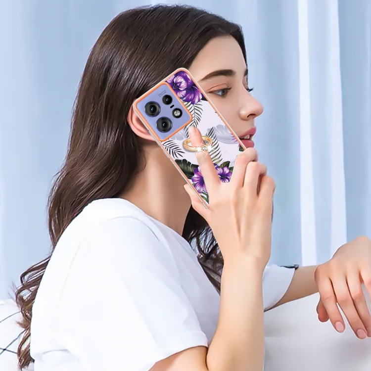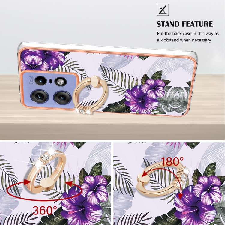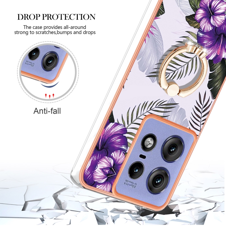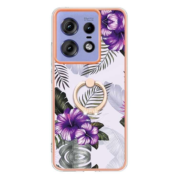 Funda TPU Motorola Edge 50 Pro a Prueba de Golpes con Patrón Galvanoplastia y Soporte Anillo (Flor Morada)