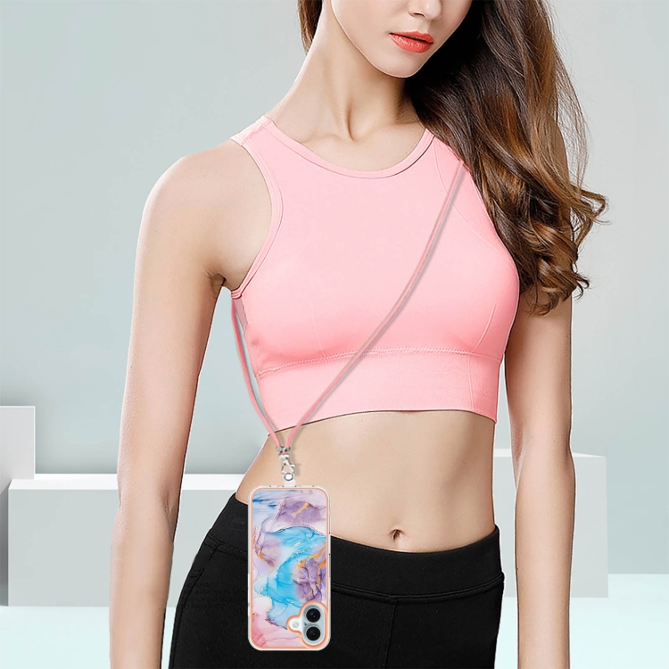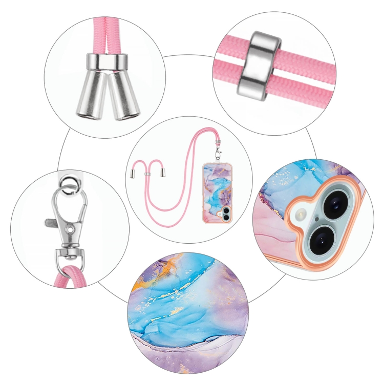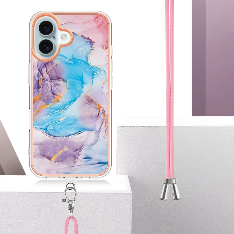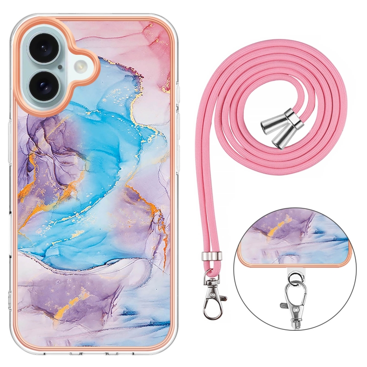 Funda a Prueba de Golpes TPU con Patrón Galvanoplastia Imd para iPhone 16 con Cordón (Mármol Azul Vía Láctea)