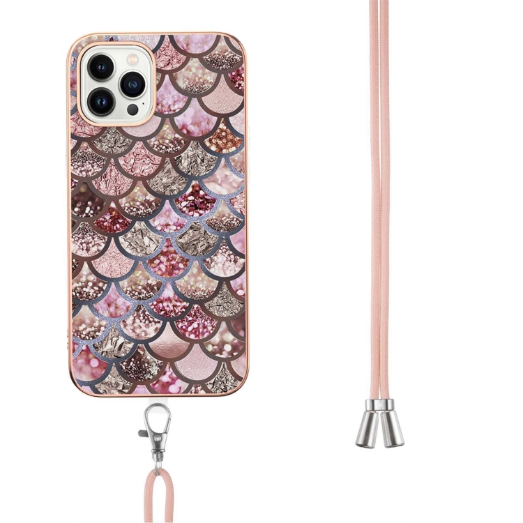 Funda a Prueba de Golpes con Patrón de Galvanoplastia Imd TPU para iPhone 16 Pro Max con Cordón para el Cuello (Escamas Rosas)