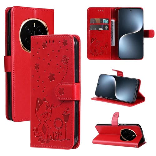 Funda de Cuero para Honor Magic7 a Prueba de Golpes con Estampado de Abeja y Gato (Rojo)