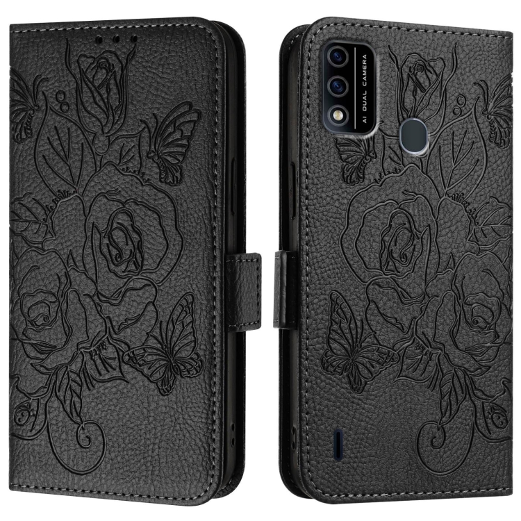 Funda de Cuero Antirrobo RFID para Teléfono Itel A48 con Diseño Rosa en Relieve (Negra)