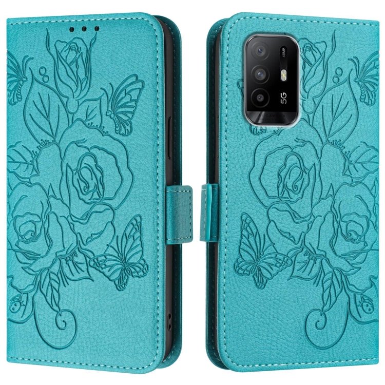Funda de Cuero Antirrobo Rfid con Relieve Rosa para Oppo Reno6 Lite (Azul Claro)