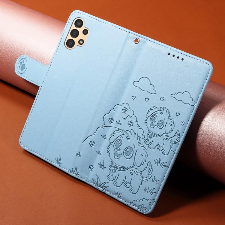Funda de cuero con bloqueo RFID para Samsung Galaxy A13 4G/5G, con diseño de corazón y perro en relieve (azul cielo)