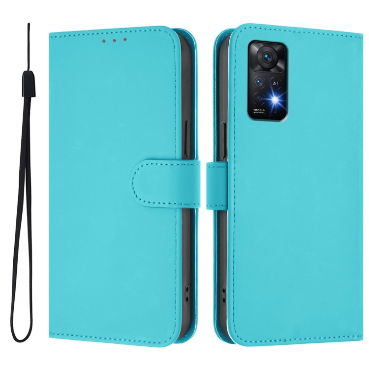 Funda de Cuero con Cordón para Redmi Note 11 Pro 4G, Color Sólido, Tacto Global (Azul Lago)
