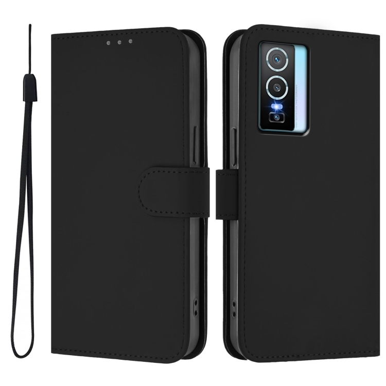 Funda de Cuero con Cordón para Teléfono con Diseño de Piel de Color Liso y Tacto Agradable para Vivo Y76 5G (Negro)