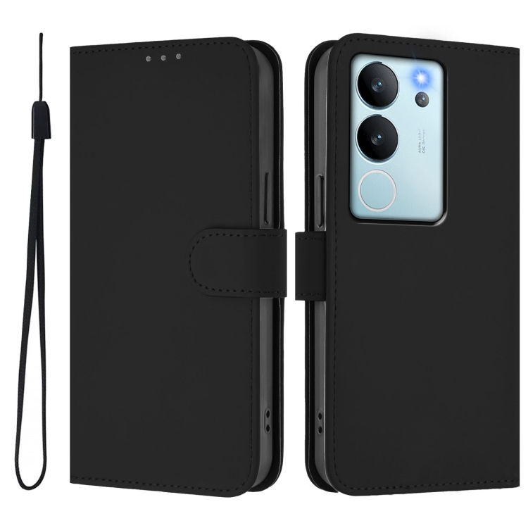 Funda de Cuero con Cordón para Teléfono con Diseño de Piel de Color Liso y Tacto Suave para Vivo V29E 5G Global / Y200 5G Global (Negro)