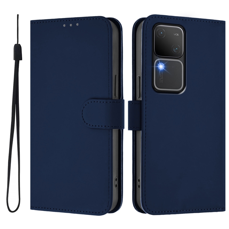 Funda de Cuero con Cordón para Teléfono con Diseño de Piel de Color Liso y Tacto Suave para Vivo V30 5G Global/V30 Pro Global (Azul Marino)