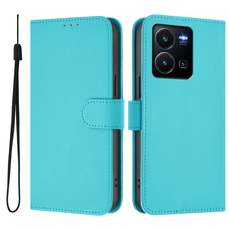 Funda de Cuero con Cordón para Teléfono con Diseño de Piel de Color Liso y Tacto Suave para Vivo Y35 4G Global / Y22S 4G Global (Azul Lago)