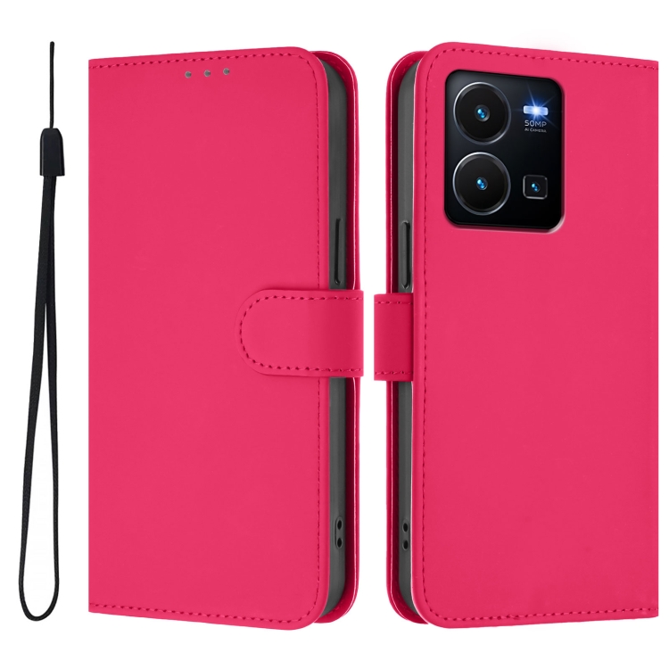 Funda de Cuero con Cordón para Teléfono con Diseño de Piel de Color Liso y Tacto Suave para Vivo Y35 4G Global / Y22S 4G Global (Rosa Rojo)