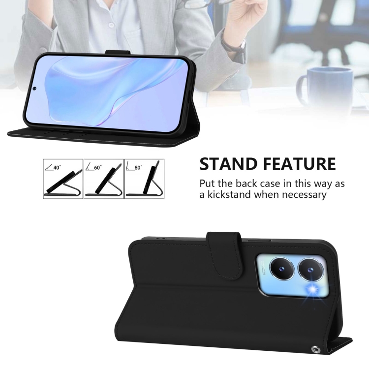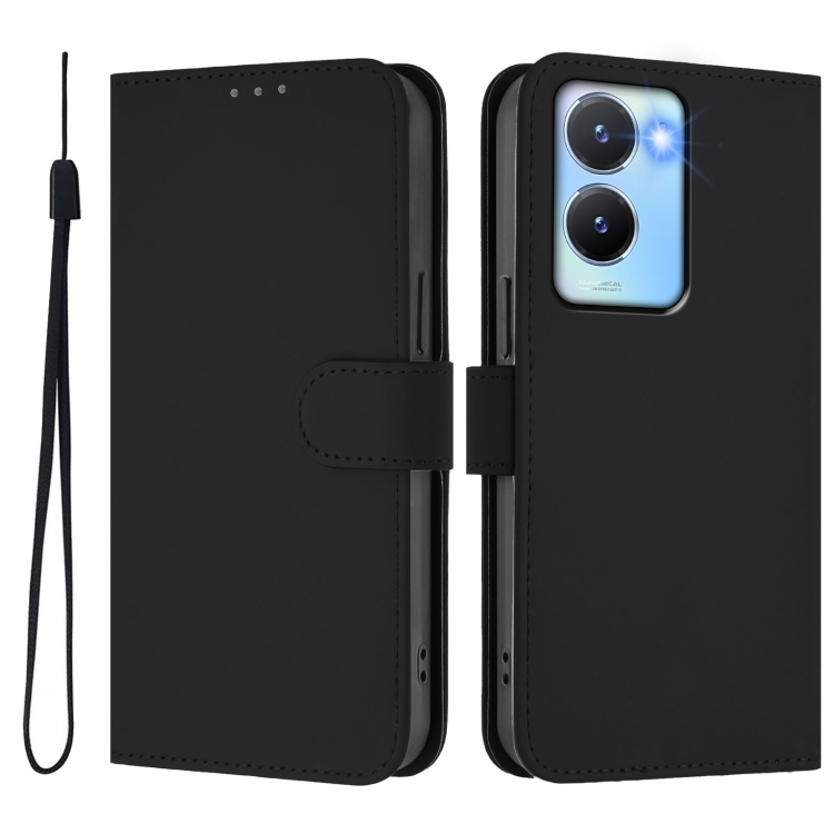 Funda de Cuero con Cordón para Teléfono con Diseño de Piel de Color Liso y Tacto Suave para Vivo Y56 5G Global / Y16 4G Global (Negro)