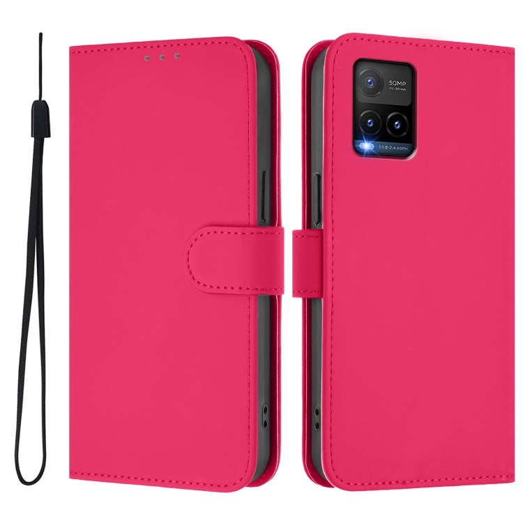Funda de Cuero con Cordón para Teléfono con Diseño de Piel de Color Sólido y Tacto Suave para Vivo Y33S 4G Global / Y21 2021 (Rosa Rojo)