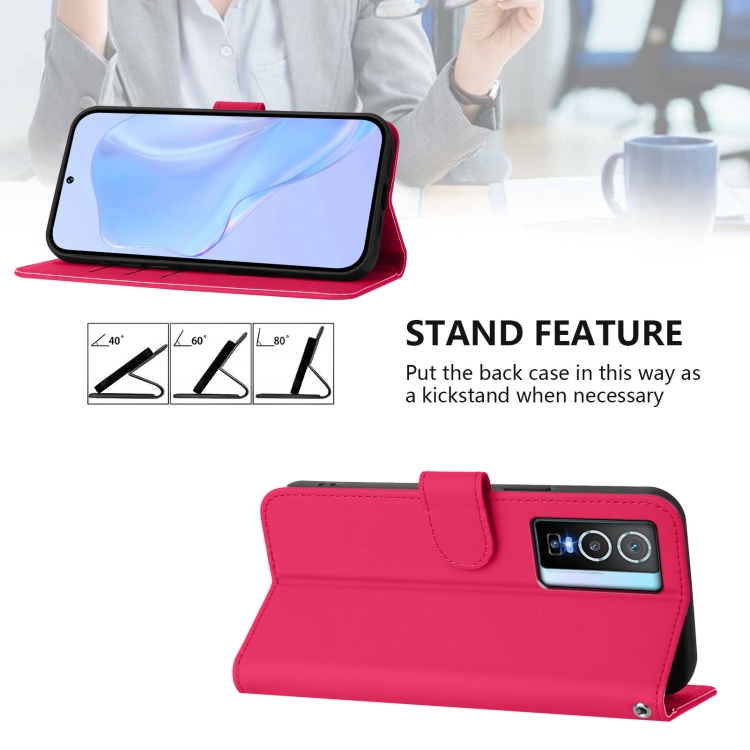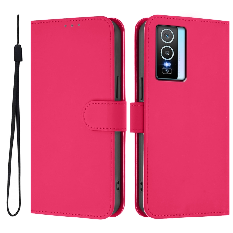 Funda de Cuero con Cordón para Teléfono con Diseño de Piel de Color Sólido y Tacto Suave para Vivo Y76 5G (Rosa y Rojo)