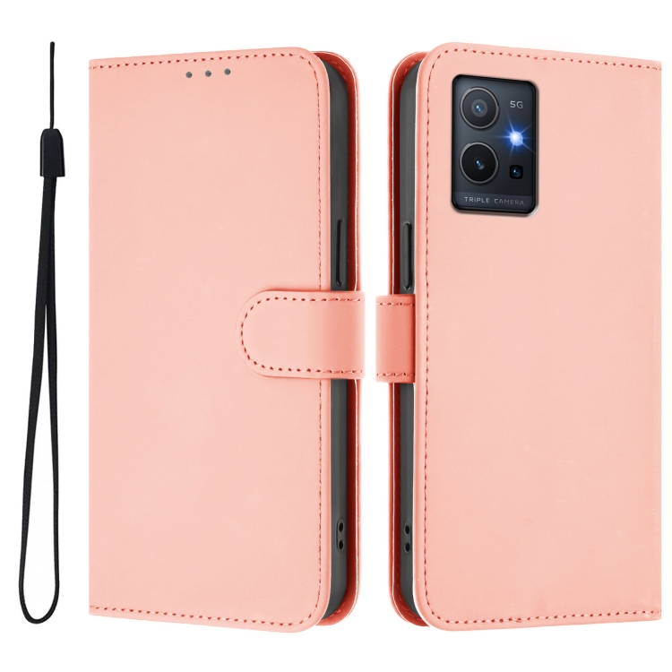 Funda de Cuero con Cordón para Teléfono con Diseño Global de Piel Sintética de Color Sólido y Tacto Suave para Vivo Y55S 2023 5G/Y55 5G (Rosa)