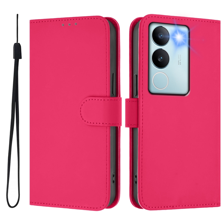 Funda de Cuero con Cordón para Teléfono con Sensación de Piel de Color Sólido para Vivo V29 5G Global / V29 Pro (Rosa Rojo)
