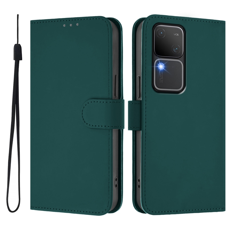 Funda de Cuero con Cordón para Teléfono con Sensación de Piel de Color Sólido para Vivo V30 5G Global / V30 Pro Global (Verde Oscuro)