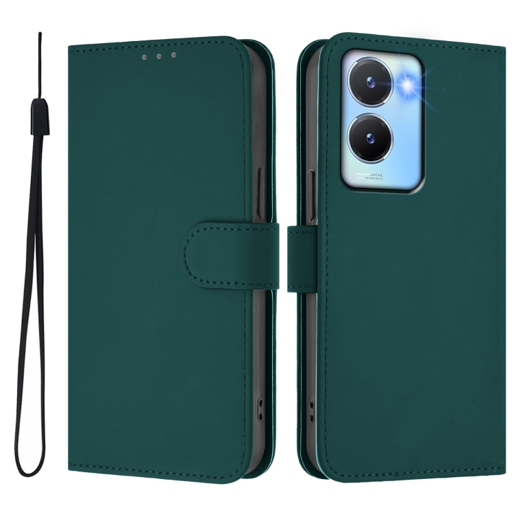 Funda de Cuero con Cordón para Teléfono con Sensación de Piel de Color Sólido para Vivo Y56 5G Global / Y16 4G Global (Verde Oscuro)