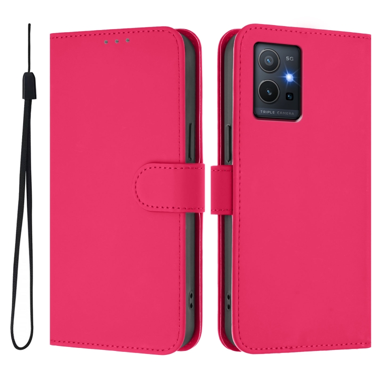 Funda de Cuero con Cordón para Teléfono con Sensación de Piel Global para Vivo Y55S 2023 5G / Y55 5G (Rosa y Rojo)