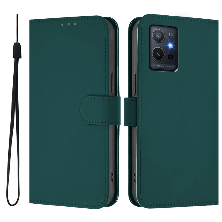 Funda de Cuero con Cordón para Teléfono con Sensación de Piel Global para Vivo Y55S 2023 5G / Y55 5G (Verde Oscuro)