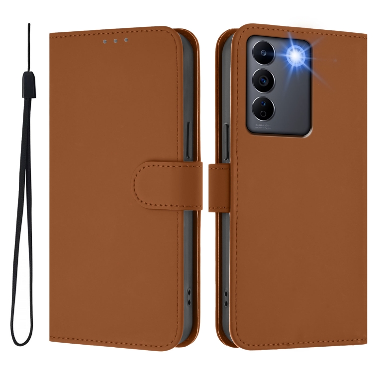 Funda de Cuero con Cordón para Teléfono con Tacto de Piel de Color Liso para Vivo V27E 4G Global / T2 4G Global (Marrón)