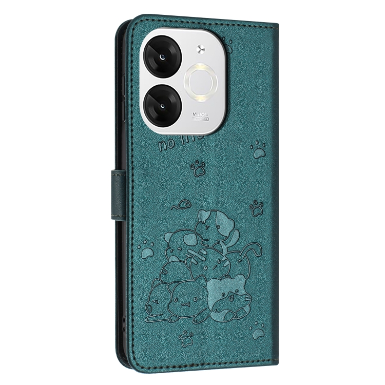 Funda de Cuero con Cordón para Teléfono Itel A80 con Diseño de Gatito en Relieve (Verde Oscuro)