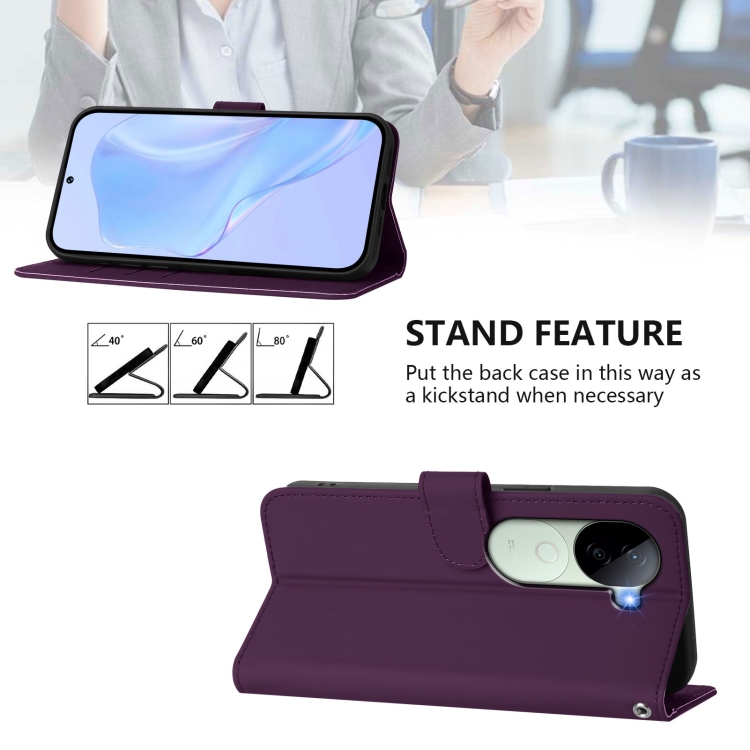 Funda de Cuero con Cordón para Teléfono Vivo V40E 5G India / Iqoo Z9S 5G con Tacto de Piel de Color Sólido (Violeta)