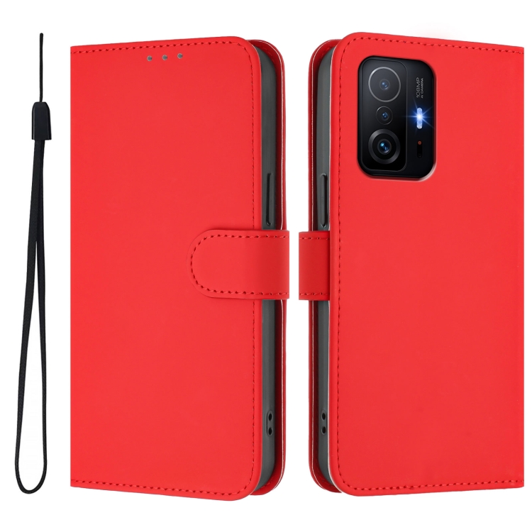 Funda de Cuero con Cordón para Teléfono Xiaomi 11T / 11T Pro con Tacto de Piel de Color Sólido (Rojo)