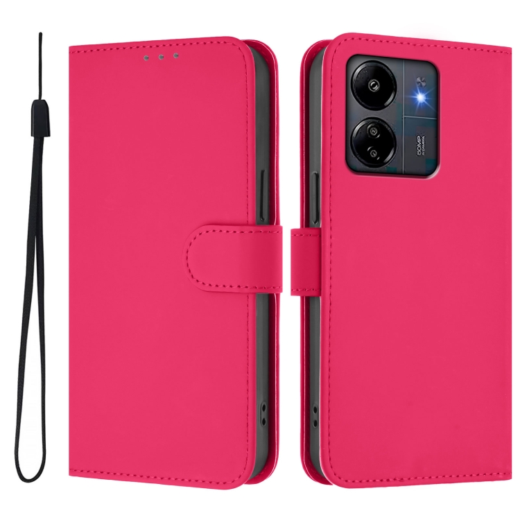 Funda de Cuero con Cordón para Teléfono Xiaomi Poco C6 Global / M6 5G Global con Tacto de Piel de Color Sólido (Rosa Rojo)