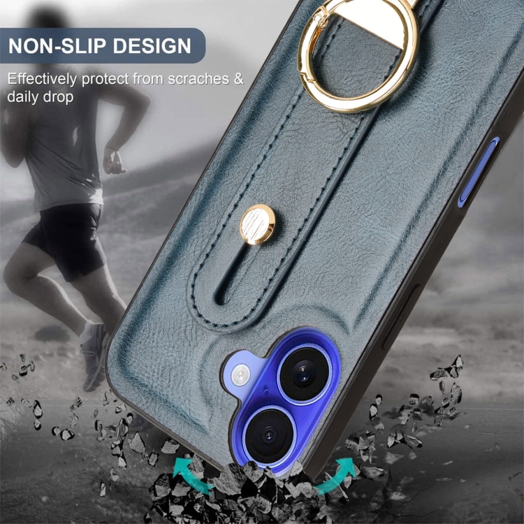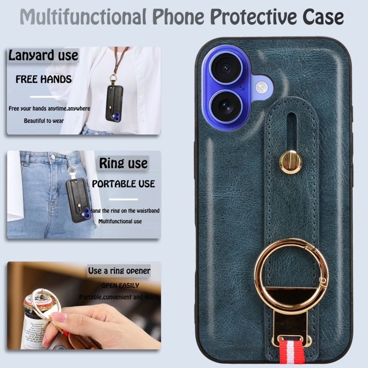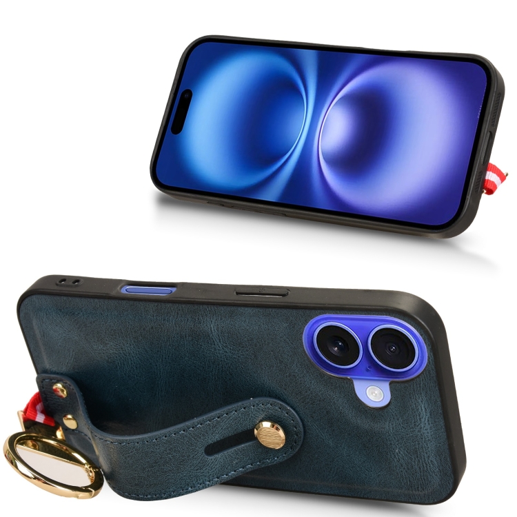 Funda de Cuero con Correa para la Muñeca para iPhone 16 Plus (Azul)