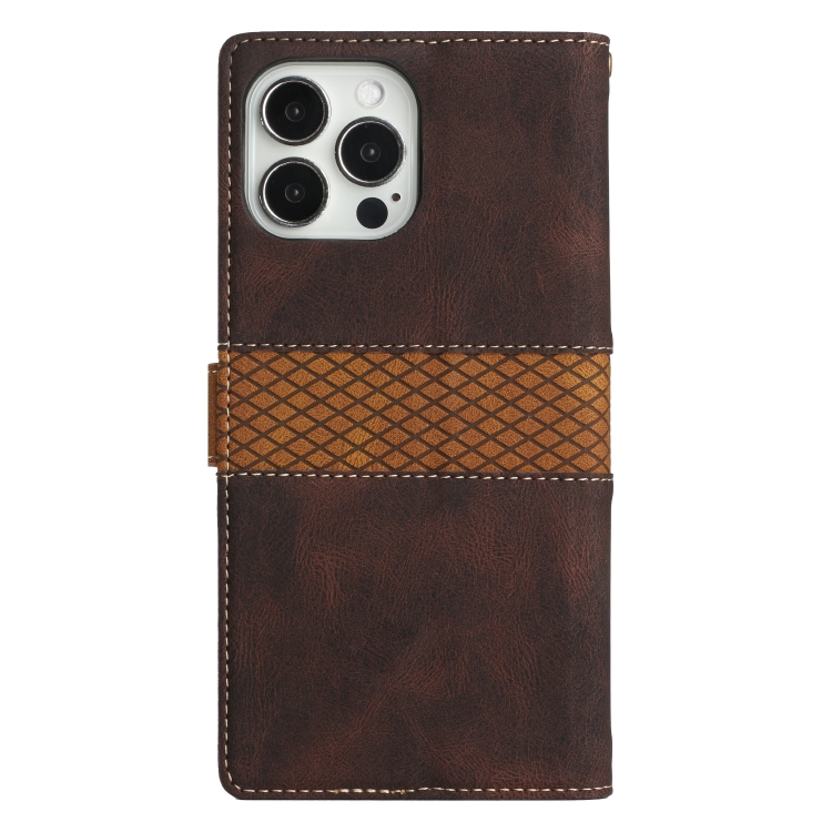 Funda de Cuero para iPhone 13 Pro con Cordón Costuras en Cuadrícula (Marrón)