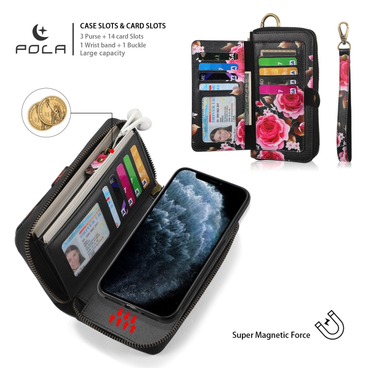 Funda de Cuero con Cremallera Multifuncional para iPhone 11 Pro Max Pola Flower (Negro)