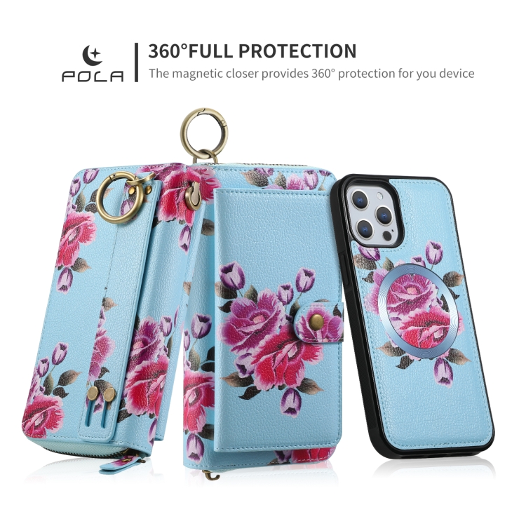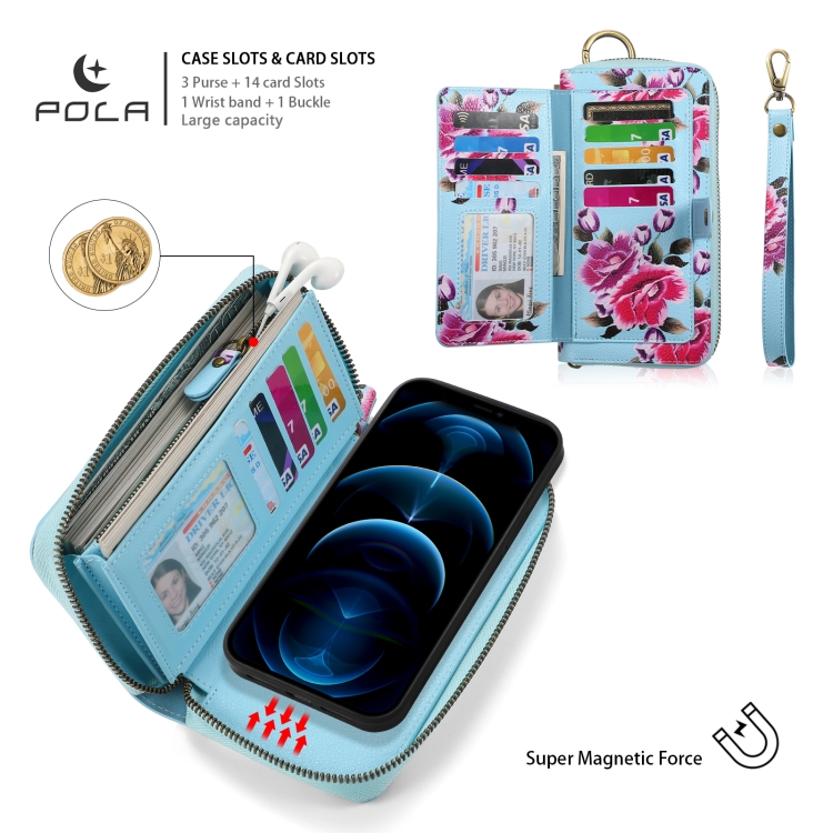 Funda de Cuero Pola para iPhone 12/12 Pro con Cremallera Multifuncional Magsafe (Azul Cielo)