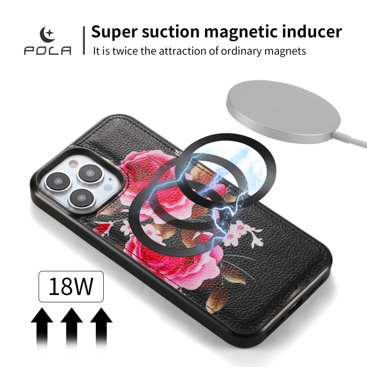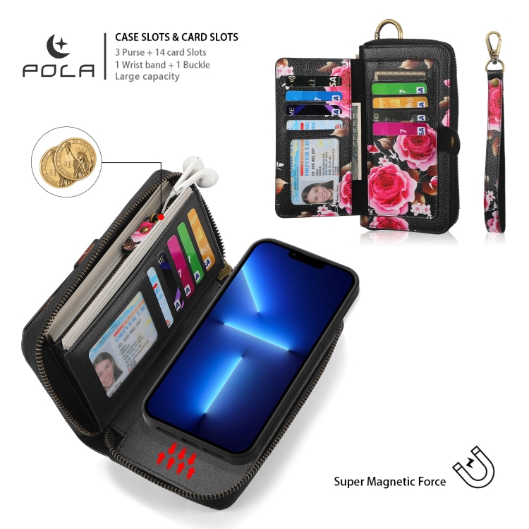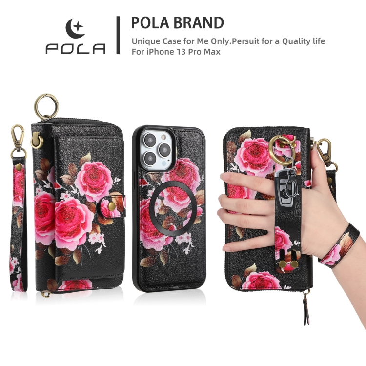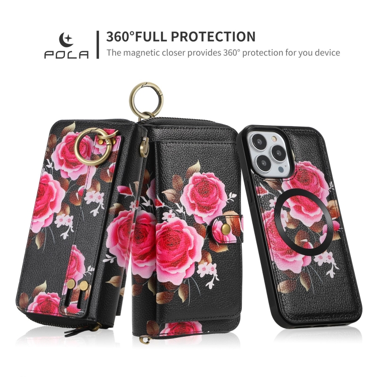 Funda de Cuero con Cremallera Multifuncional para iPhone 13 Pro Pola Magsafe Flower (Negra)
