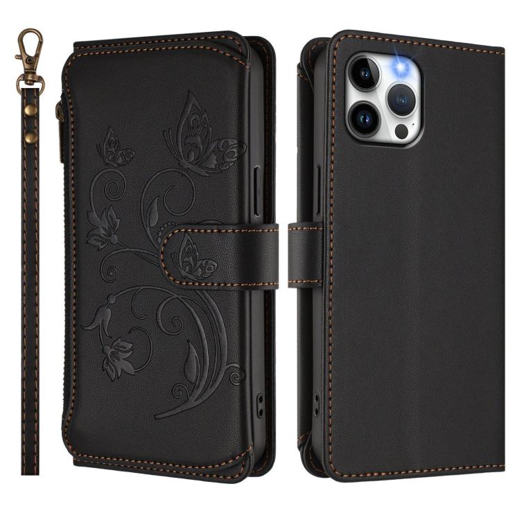 Funda de cuero con cremallera para iPhone 12 Pro Max, diseño de mariposas, flores y amor, con múltiples tarjetas (negro)