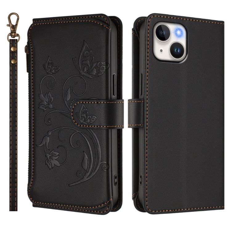 Funda de cuero con cremallera para iPhone 13 mini, diseño de mariposas, flores y amor, con múltiples tarjetas (negro)