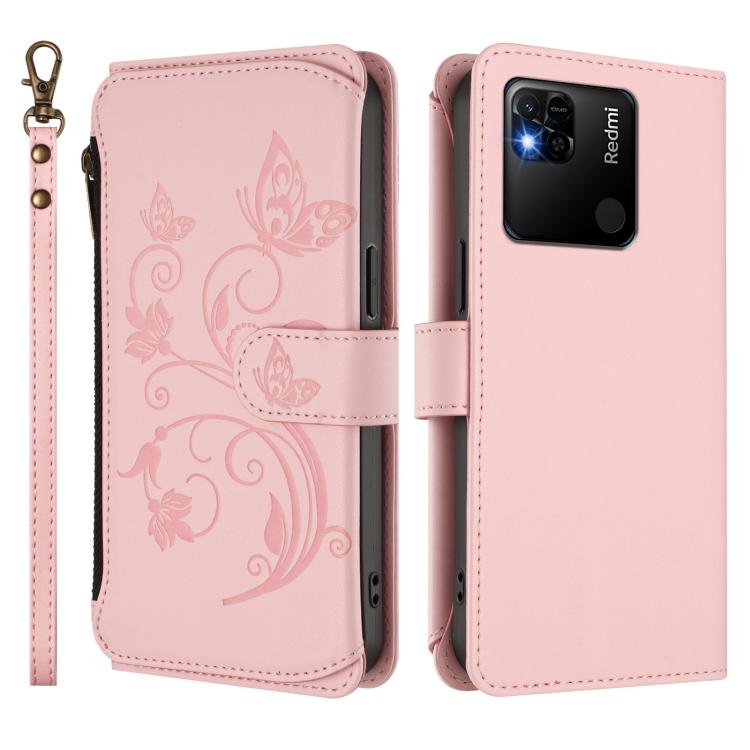 Funda de cuero con cremallera para Redmi 10A/Redmi 9C, diseño de mariposas, flores y mariposas (rosa)