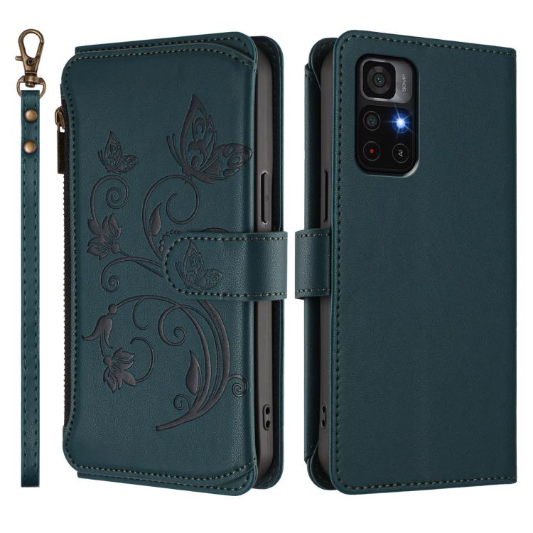 Funda de cuero con cremallera para Redmi Note 11S 5G / Xiaomi Poco M4 Pro 5G, diseño de mariposas y flores, con múltiples tarjetas (verde oscuro)