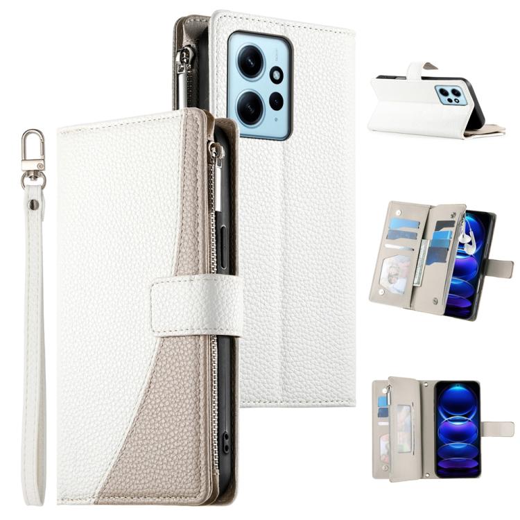 Funda de cuero con cremallera para Redmi Note 12 4G Global / Note 12R Pro, con costuras, para múltiples tarjetas y correa corta (blanca)