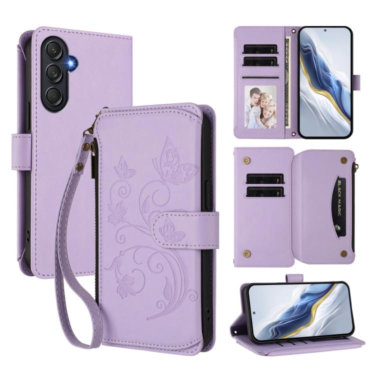 Funda de cuero con cremallera para Samsung Galaxy M55/C55, diseño de mariposas, flores y amor, con múltiples tarjetas (morado claro)