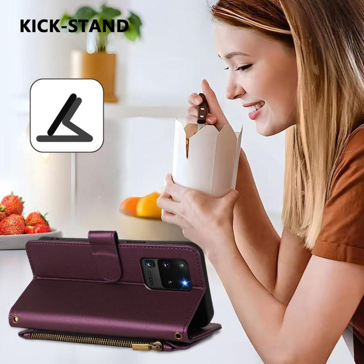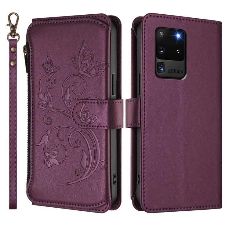 Funda de cuero con cremallera para Samsung Galaxy S20 Ultra, diseño de mariposas, flores y amor, con múltiples tarjetas (morado oscuro)